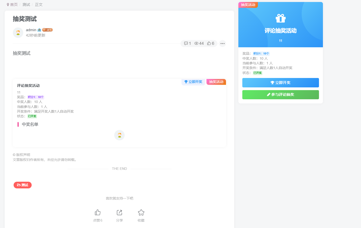 1.这是一款子比主题的评论抽奖功能,这款功能包含了子比的评论抽奖、中奖和中奖奖品(积分、余额、会员、邀请码、自定义等功能),可设置自动开奖人数或开奖时间,并且可以设置活动幻灯片效果,并带有侧边抽奖小工具功能