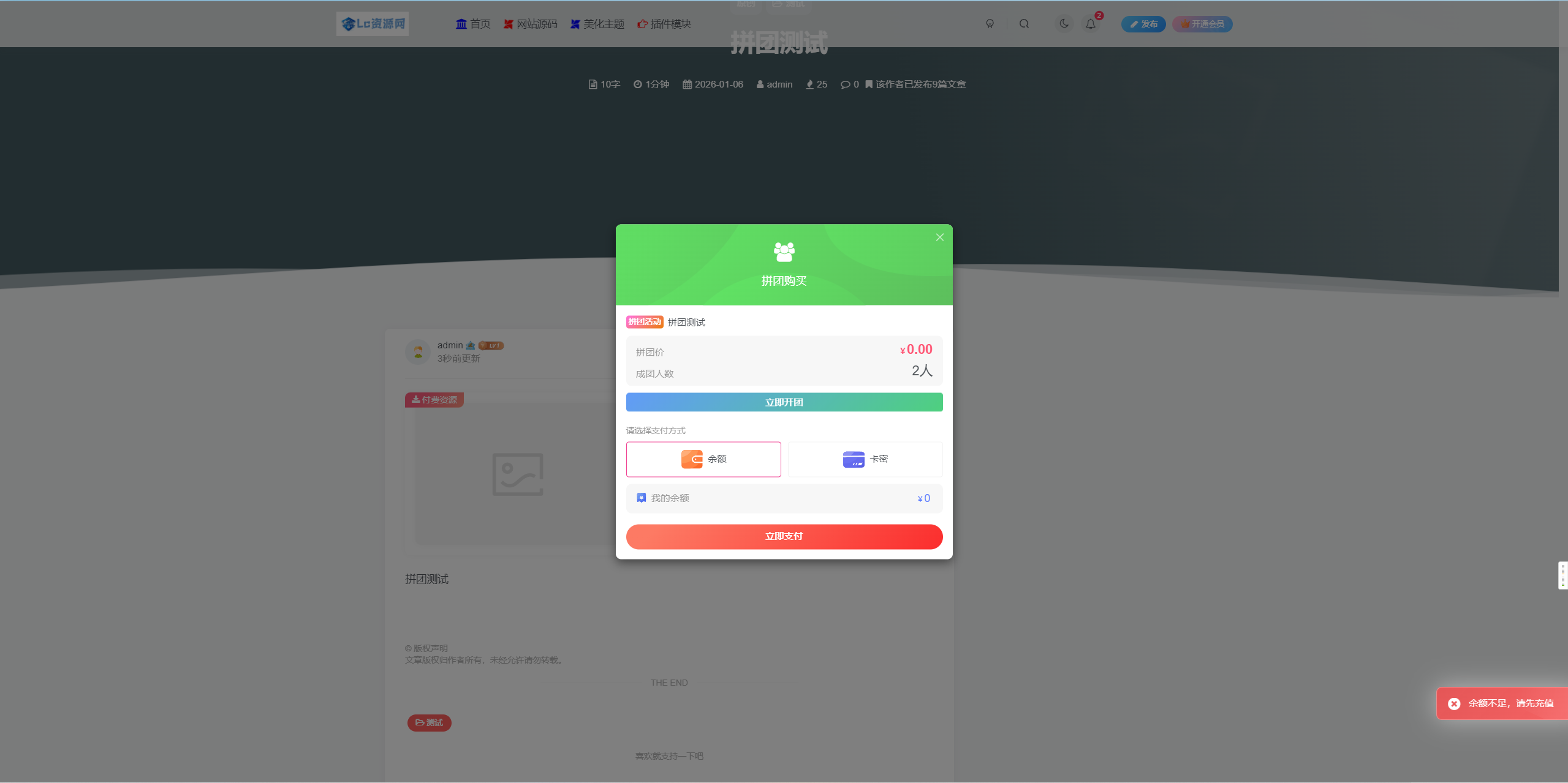 这款拼团插件基础版本功能比较少,目前只支持拼团和拼团额外奖励。基本足够拼团使用了,但是我测试不知道为什么会提示余额不足,但是实际是可以用的可以自行研究下的