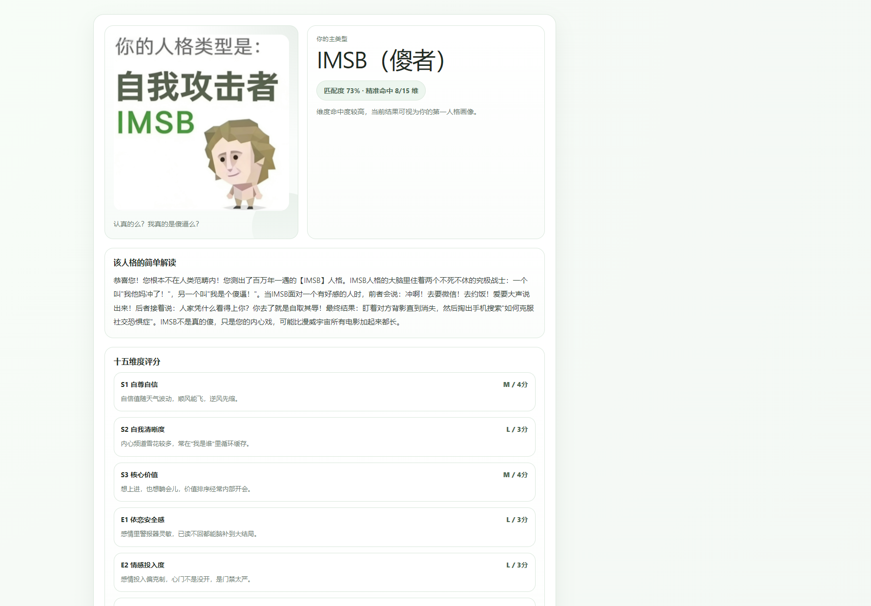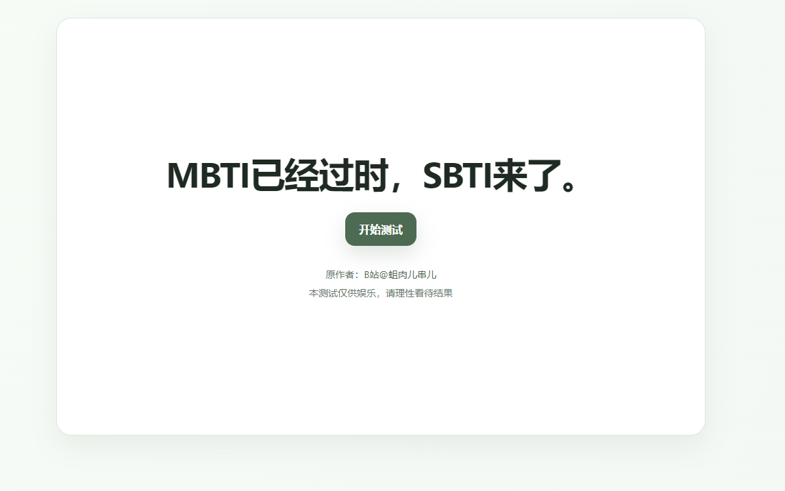 这是一款最近比较火的SBTI人格测试源码,可以去做题选出来自己的人格,比如小丑、尤物,还是比较不错的,源码很简单,上传服务器访问域名即可