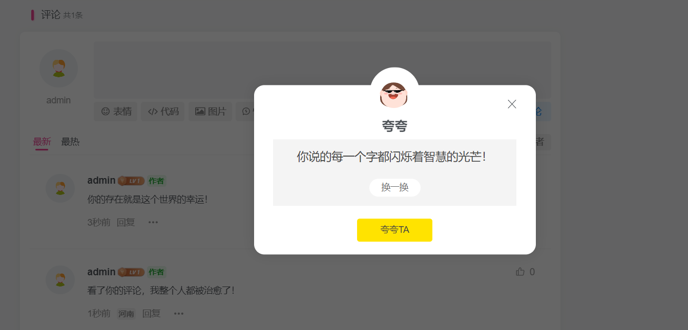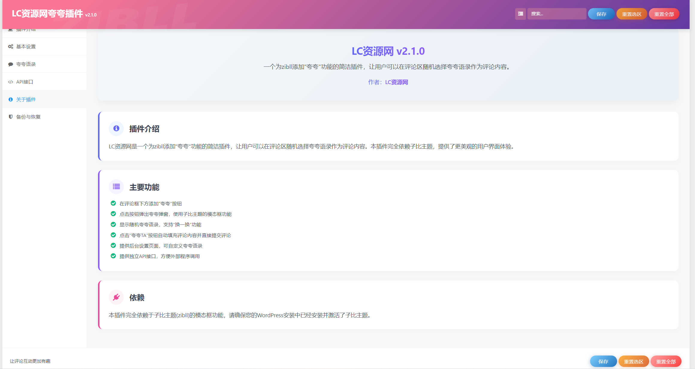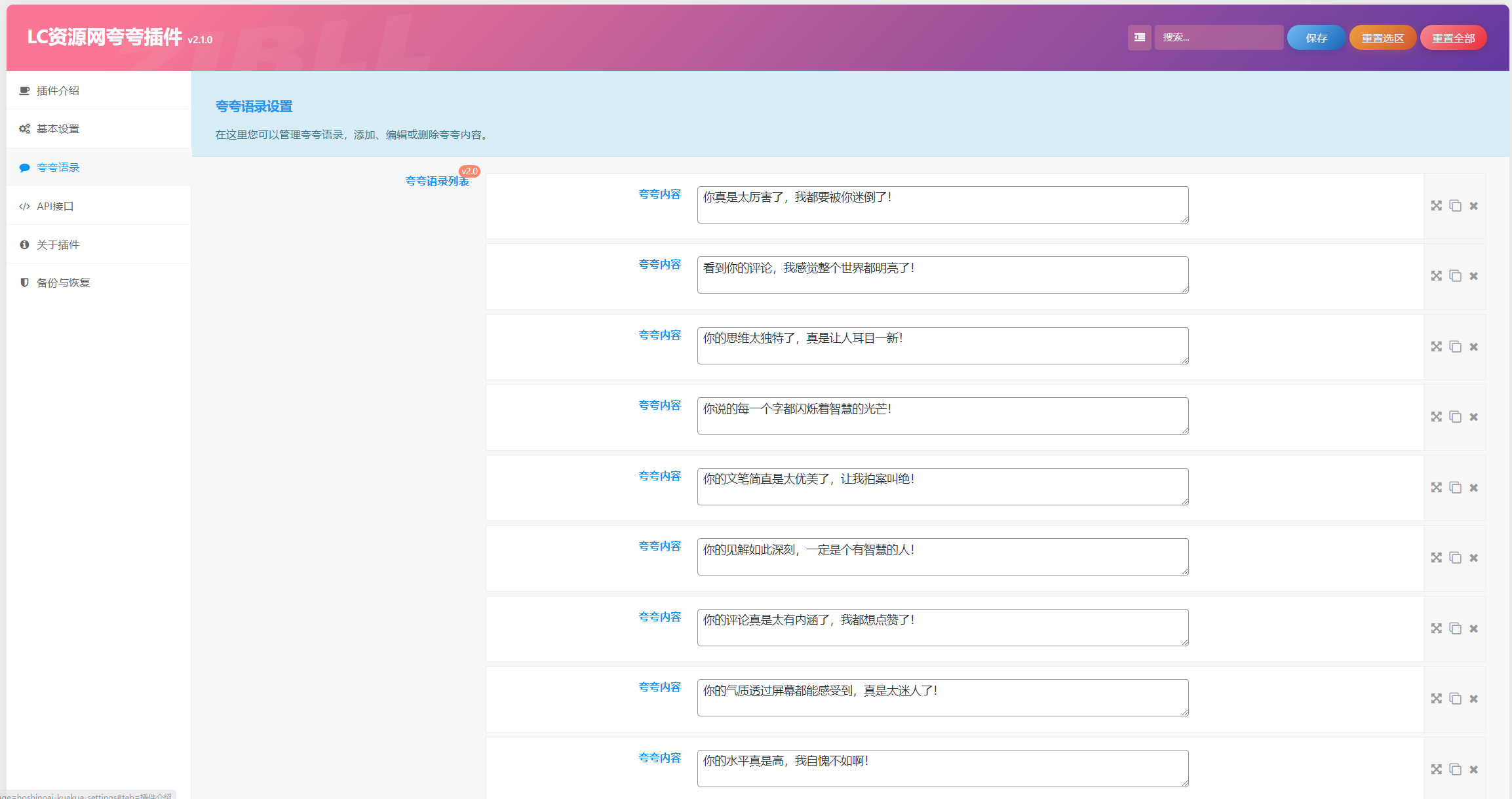 子比主题夸夸插件 作者 : LC资源网 发布时间: 2025-09-24 共977人阅读 给子比主题评论的地方加一个夸夸的插件,非常的快捷方便,方便的可以使用,快速插入到子比主题评论区并且自动发送评论,非常方便 公告: 1. 本站所有资源来源于用户上传和网络,如有侵权请邮件联系站长! 2. 分享目的仅供大家学习和交流,您必须在下载后24小时内删除! 3. 不得使用于非法商业用途,不得违反国家法律。否则后果自负! 4. 本站提供的源码、模板、插件等等其他资源,都不包含技术服务请大家谅解! 5. 如有链接无法下载、失效或广告,请联系管理员处理! 6. 本站资源售价只是摆设,本站源码仅提供给会员学习使用! 7. 如遇到加密压缩包,请使用360解压,如遇到无法解压的请联系管理员!LC资源网 » 子比主题夸夸插件